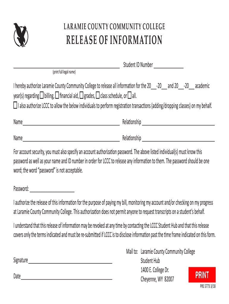 LARAMIE COUNTY COMMUNITY COLLEGERELEASE OF INFORMATION Student ID Number (print full legal name)I hereby authorize Laramie County Community College to release all information for the 20 20 and 20