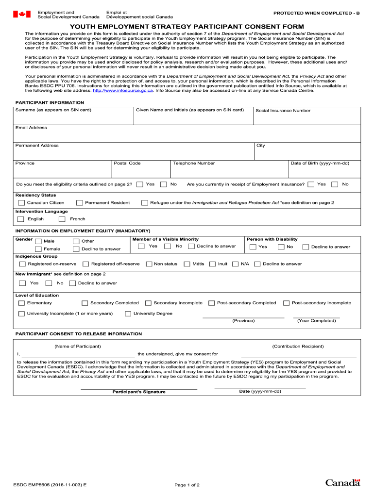 Employment and Social Development CanadaEmploi et Development social CanadaPROTECTED WHEN COMPLETED YOUTH EMPLOYMENT STRATEGY PARTICIPANT CONSENT From The information you provide on this form is collected
