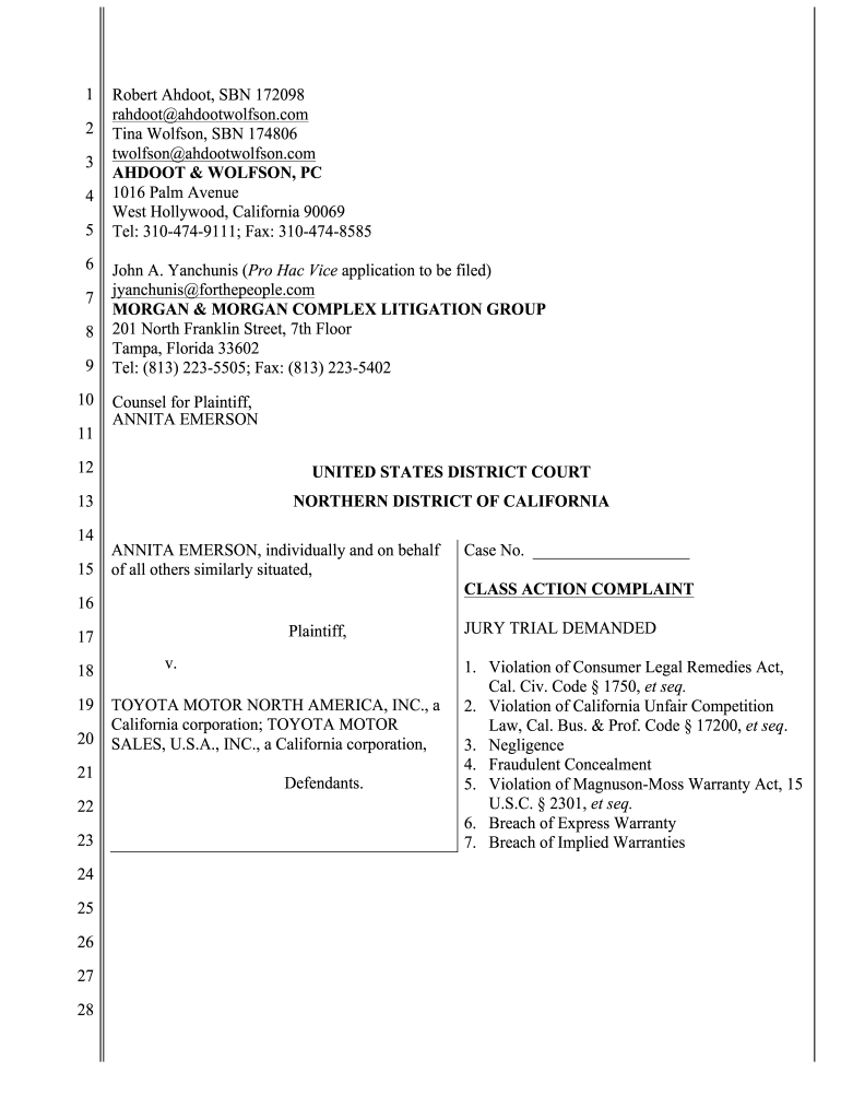 Emerson v Toyota Motor is relevant to individuals or entities involved in a legal case or dispute related to the actions or products of Toyota Motor Corporation. This may include plaintiffs, defendants, or their legal representatives who are seeking legal remedies, compensations, or resolutions regarding alleged damages, injuries, or violations caused by Toyota Motor Corporation. It is important to consult with legal professionals to determine the specific circumstances and eligibility for filing under Emerson v Toyota Motor.