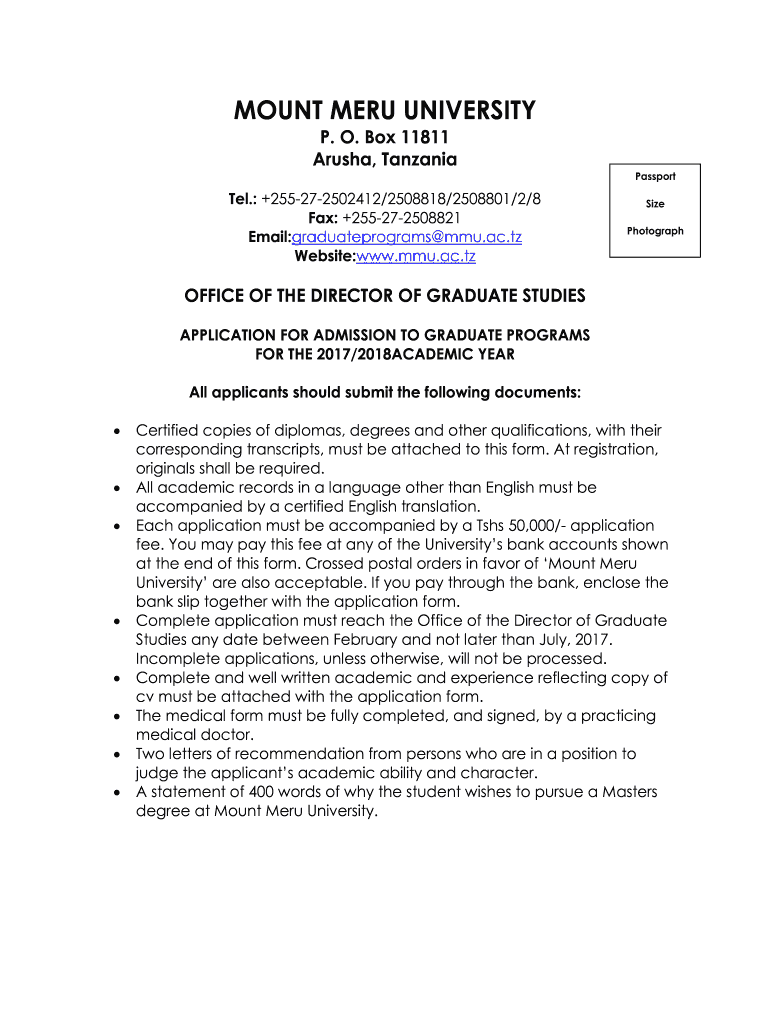 MOUNT MENU UNIVERSITY P. O. Box 11811 Arusha, Tanzania Passport.: +255272502412/2508818/2508801/2/8 Fax: +255272508821 Email:graduate programs MMU.ac.TZ Website:www.mmu.ac.tzSize PhotographOFFICE