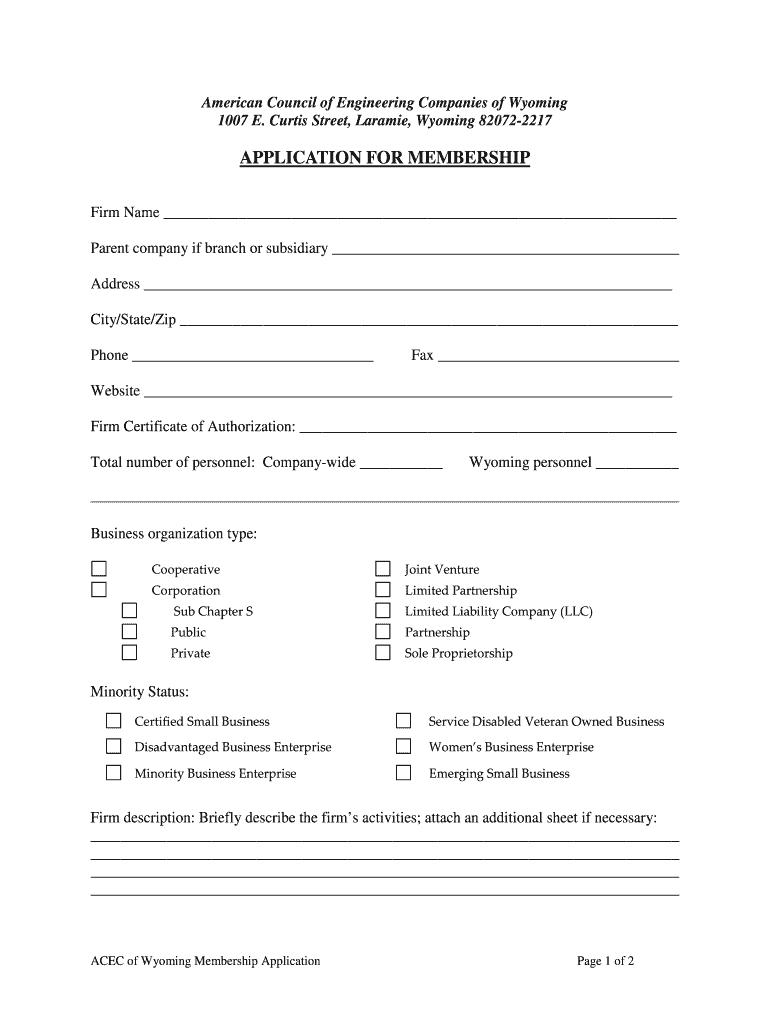 American Council of Engineering Companies of Wyoming 1007 E. Curtis Street, Laramie, Wyoming 820722217APPLICATION FOR MEMBERSHIP Firm Name Parent company if branch or subsidiary Address City/State/Zip