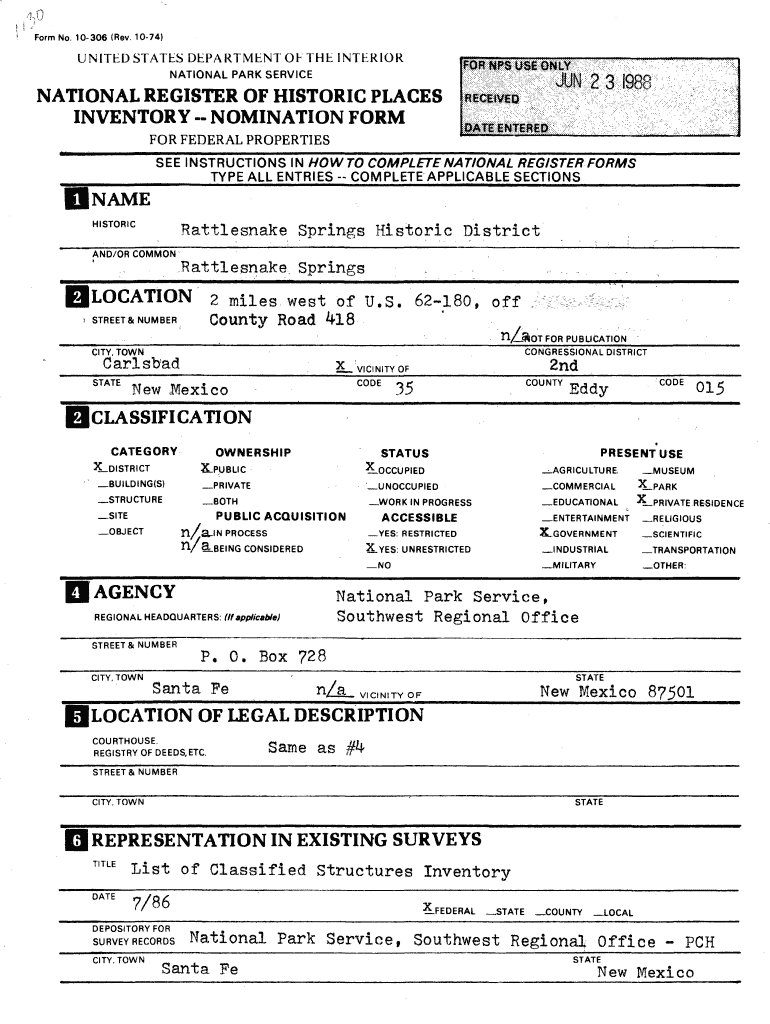 Form No. 10306 (Rev. 1074)UNITED STATES DEPARTMENT OF THE INTERIOR NATIONAL PARK SERVICENATIONAL REGISTER OF HISTORIC PLACES INVENTORY NOMINATION FORM FOR FEDERAL PROPERTIES SEE INSTRUCTIONS IN HOW
