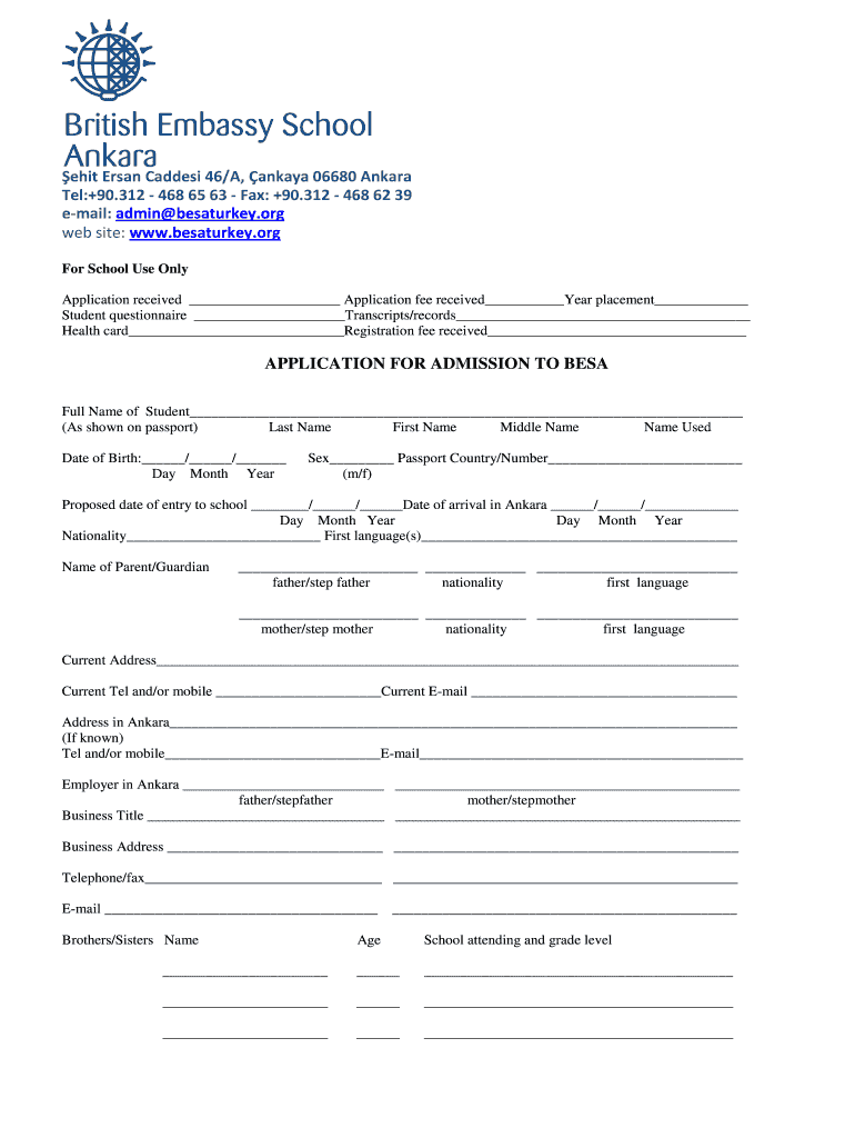 Hit ENSAN Cadres 46/A, Ankara 06680 Ankara Tel:+90.312 468 65 63 Fax: +90.312 468 62 39 email: admin hematuria.org website: www.besaturkey.org For School Use Only Application received Application