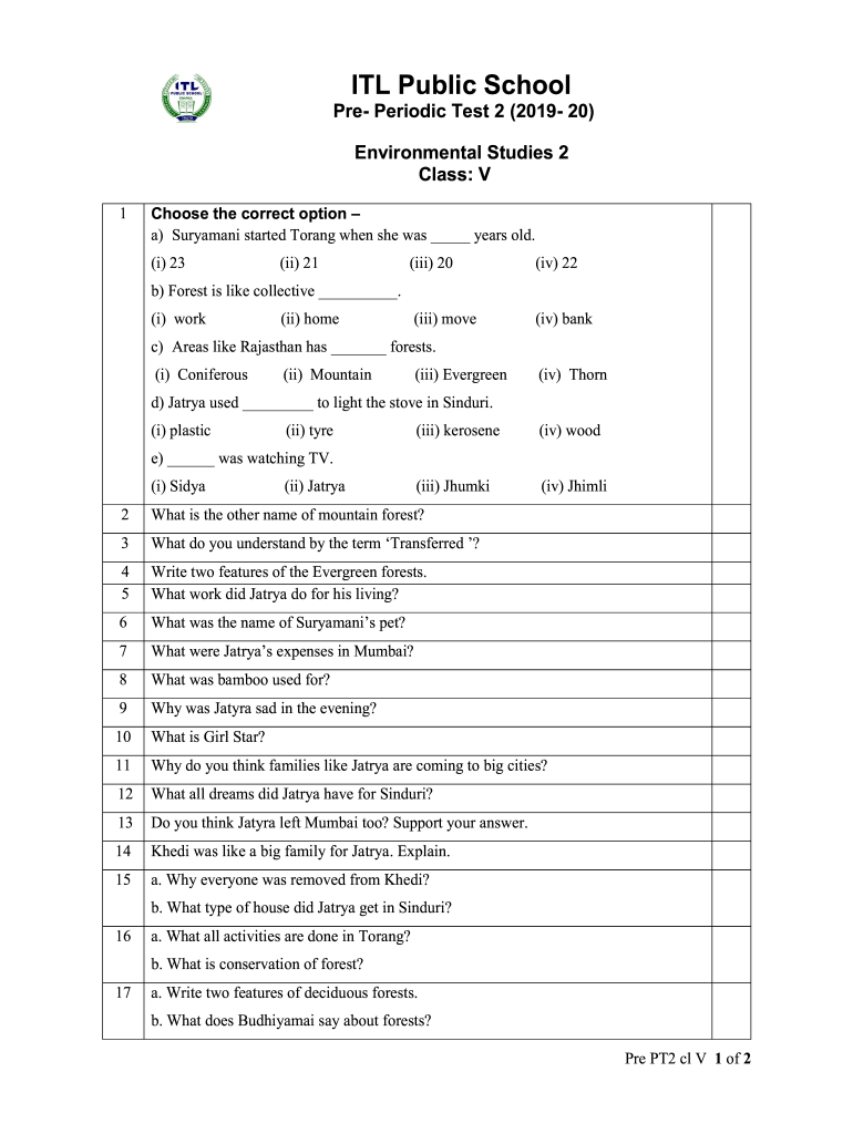 ITL Public School PRE Periodic Test 2 (2019 20) Environmental Studies 2 Class: V 1Choose the correct option a) Juryman started To rang when she was years old. (i) 23(ii) 21(iii) 20(iv) 22(iii) move(iv)