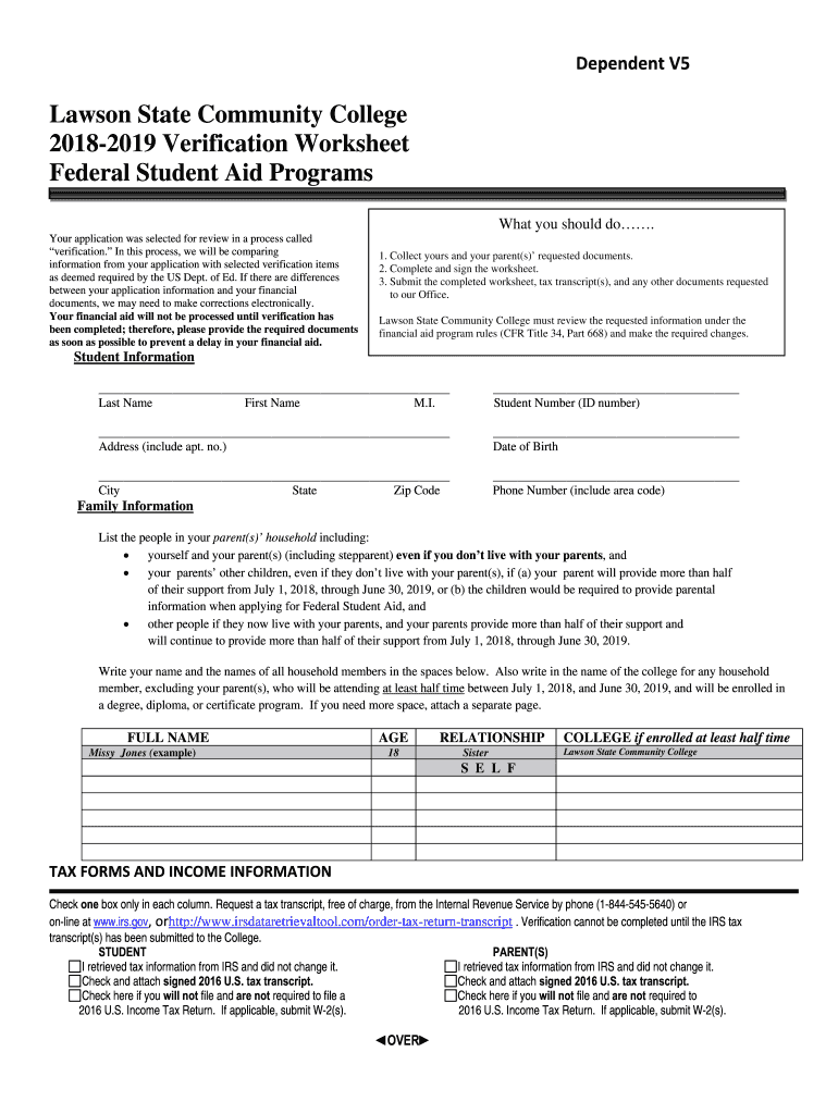 DependentV5 Lawson State Community College 20182019 Verification Worksheet Federal Student Aid Programs What you should do. Your application was selected for review in a process called verification.