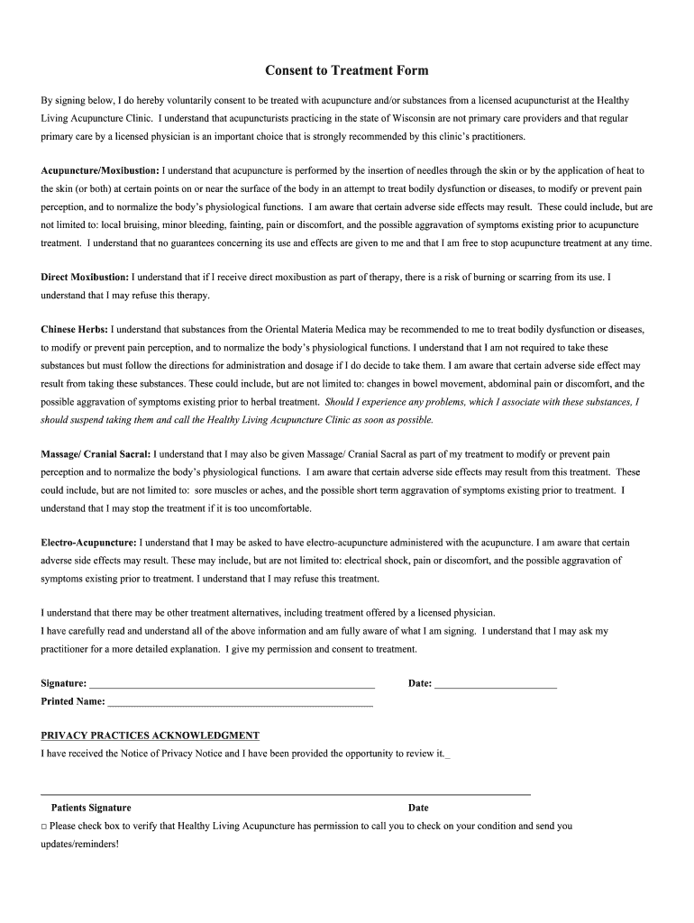 By signing below, I do hereby voluntarily consent to be treated with acupuncture and/or substances from a licensed acupuncturist at the Healthy