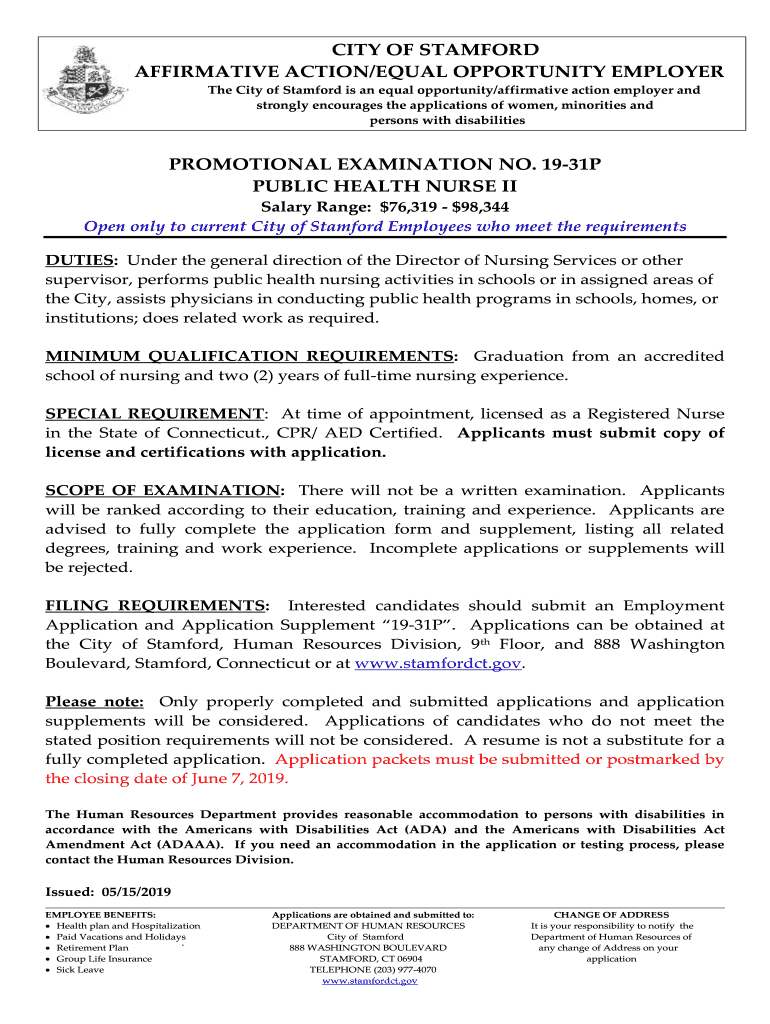 CITY OF STAMFORD AN AFFIRMATIVE ACTION/EQUAL OPPORTUNITY EMPLOYER The City of Stamford is an equal opportunity/affirmative action employer and strongly encourages the applications of women, minorities