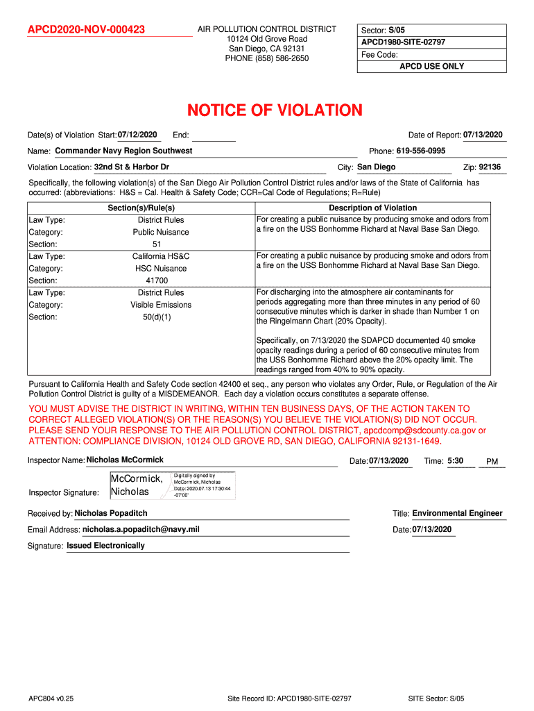 APCD2020NOV000423AIR POLLUTION CONTROL DISTRICT 10124 Old Grove Road San Diego, CA 92131 PHONE (858) 5862650Sector: S/05 APCD1980SITE02797 Fee Code: APC USE ONLYNOTICE OF VIOLATION Date(s) of Violation