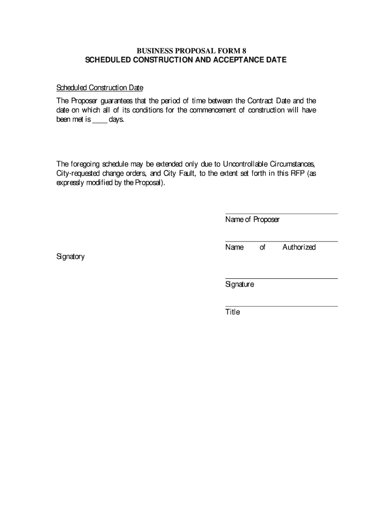 BUSINESS PROPOSAL FORM 8 SCHEDULED CONSTRUCT ION AND ACCEPTANCE Rescheduled Construction Date The Proposer guarantees that the period of time between the Contract Date and the date on which all of