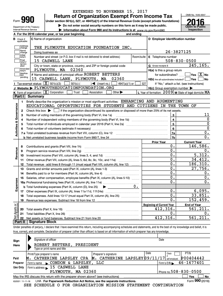 EXTENDED TO NOVEMBER 15, 2017, FormReturn of Organization Exempt From Income Tax990Under section 501(c), 527, or 4947(a)(1) of the Internal Revenue Code (except private foundations) Do not enter social