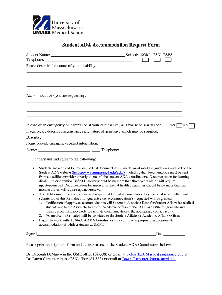 Student ADA Accommodation Request Form Student Name: School: SOME GUN SBS Telephone: Please describe the nature of your disability:Accommodations you are requesting:In case of an emergency on campus