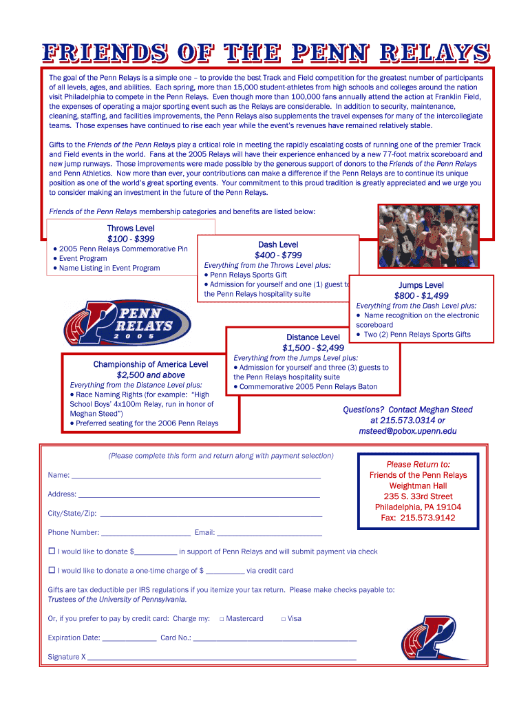 The Penn Relays Donation Form is a personal document used by donors to contribute financially to the Penn Relays, a significant track and field event held annually in Philadelphia.