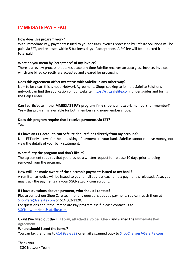 IMMEDIATE PAY FAQ How does this program work? With Immediate Pay, payments issued to you for glass invoices processed by Safe lite Solutions will be paid via EFT, and released within 5 business days