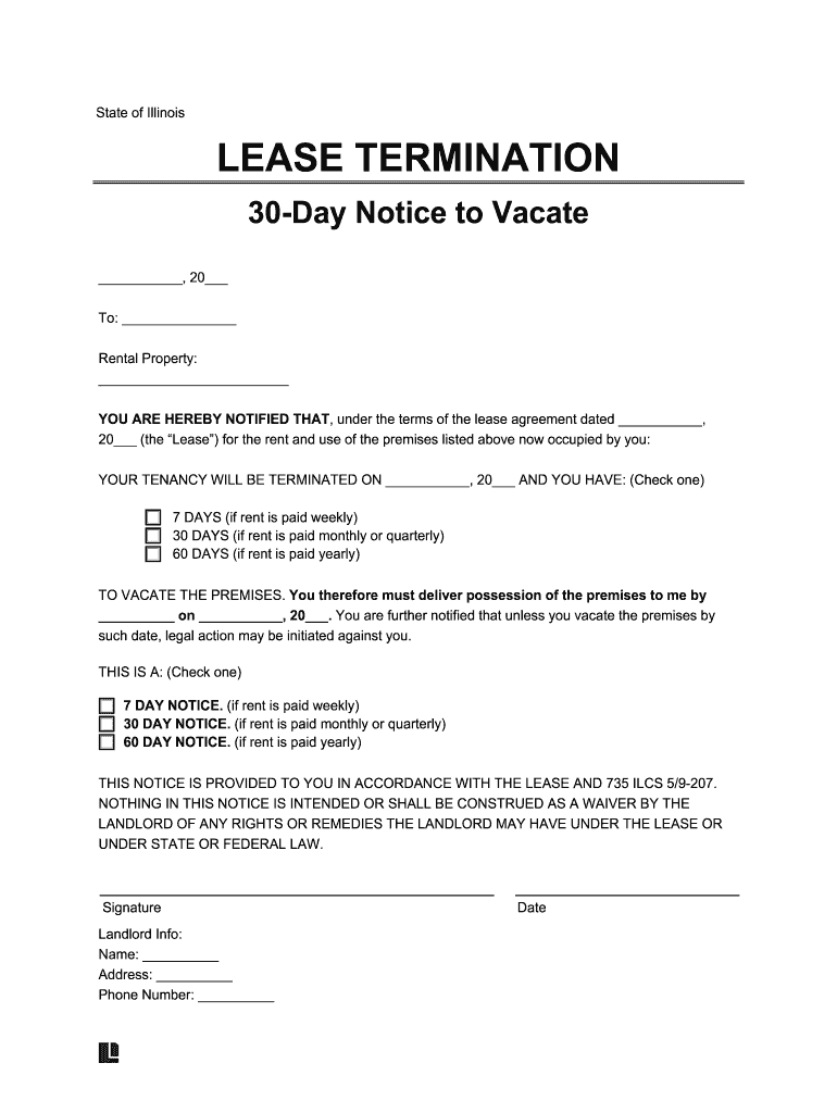 State of IllinoisLEASE TERMINATION 30Day Notice to Vacate, 20 To: Rental Property: YOU ARE HEREBY NOTIFIED THAT, under the terms of the lease agreement dated, 20 (the Lease) for the rent and use of