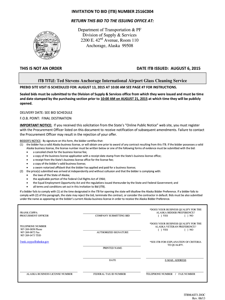 INVITATION TO BID (ITB) NUMBER 2516C004 RETURN THIS BID TO THE ISSUING OFFICE AT: Department of Transportation & PF Division of Supply & Services 2200 E. 42nd Avenue, Room 110 Anchorage, Alaska 99508THIS
