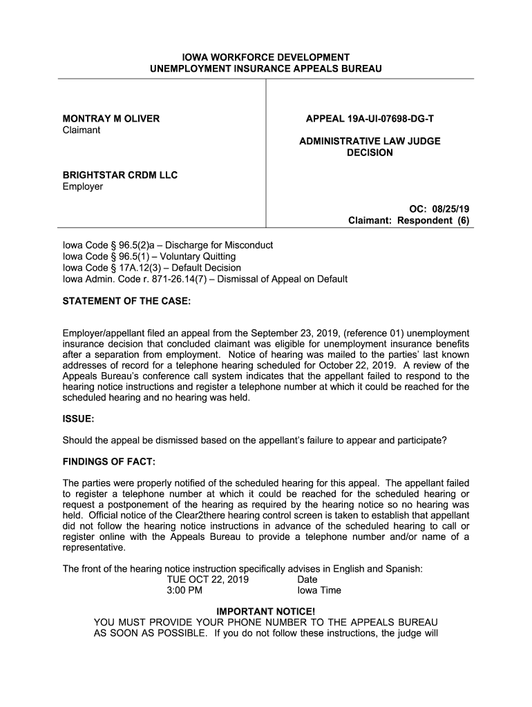 IOWA WORKFORCE DEVELOPMENT UNEMPLOYMENT INSURANCE APPEALS BUREAUMONTRAY M OLIVER ClaimantAPPEAL 19AUI07698DGT ADMINISTRATIVE LAW JUDGE DECISIONBRIGHTSTAR CRAM LLC Employer OC: 08/25/19 Claimant: Respondent