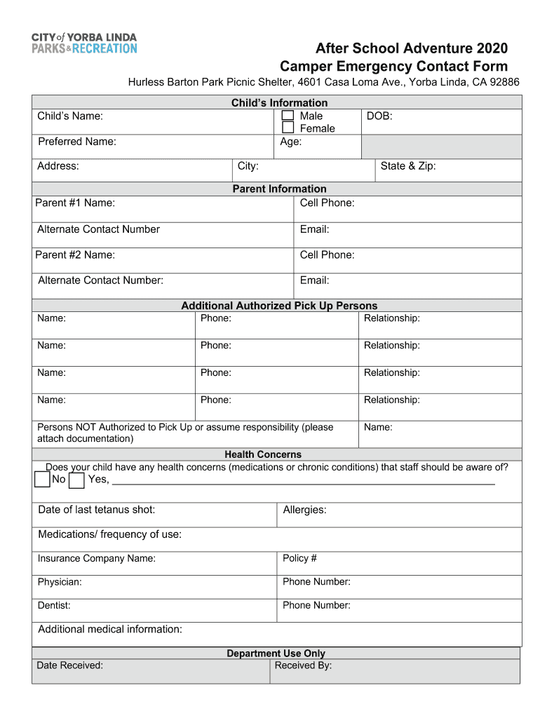 After School Adventure 2020 Camper Emergency Contact Formless Barton Park Picnic Shelter, 4601 Casey Coma Ave., Yorba Linda, CA 92886 Child's Information Male Female Age:Child's Name: Preferred Name:
