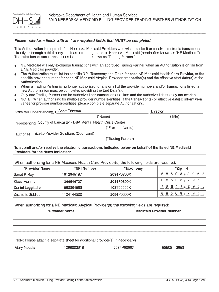 5010 NEBRASKA MEDICAID BILLING PROVIDER TRADING PARTNER AUTHORIZATIONPlease note form fields with an * are required fields that MUST be completed.