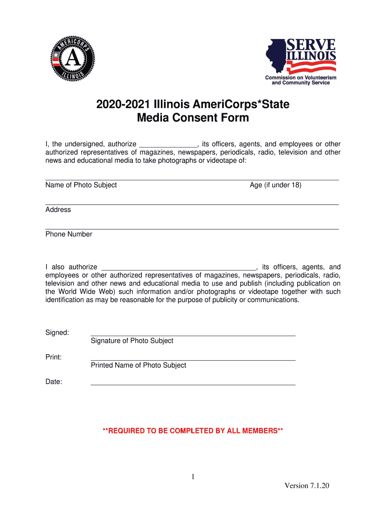 20202021 Illinois AmeriCorps×State Media Consent Form I, the undersigned, authorize, its officers, agents, and employees or other authorized representatives of magazines, newspapers, periodicals,