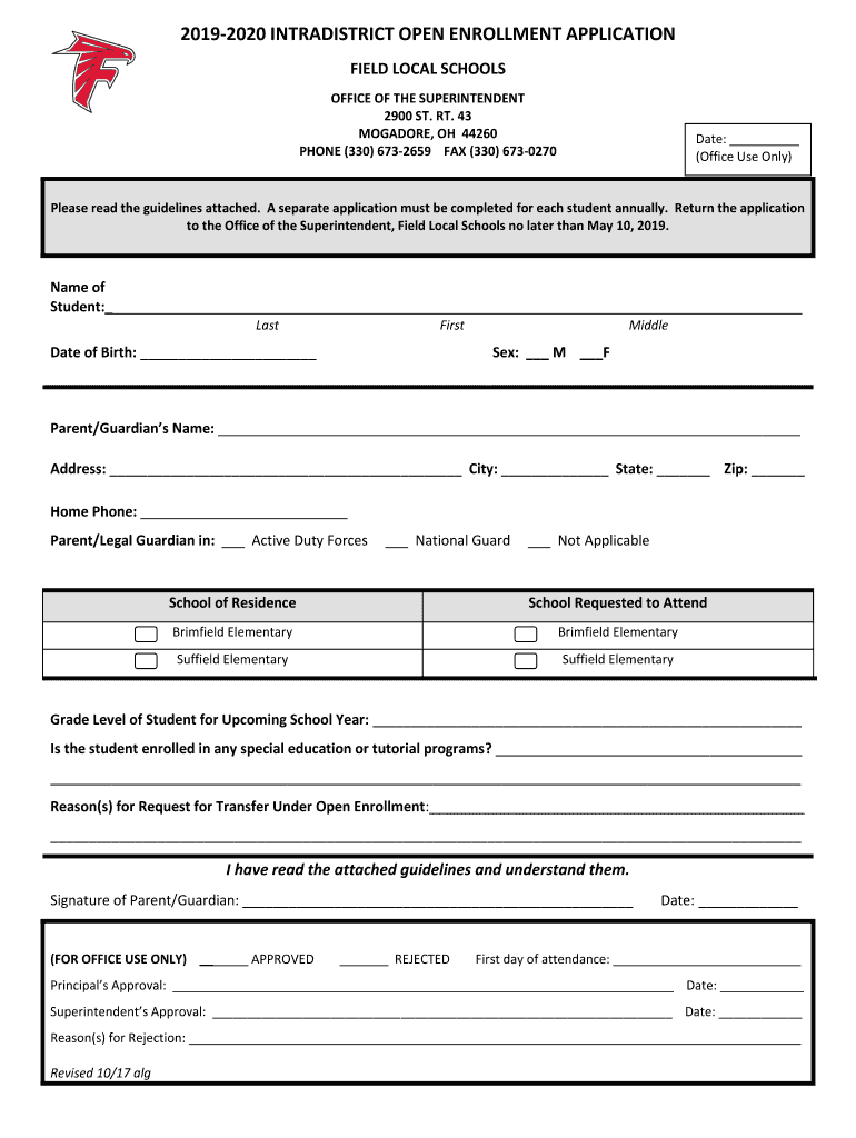 20192020 INTRADISTRICT OPEN ENROLLMENT APPLICATION FIELD LOCAL SCHOOLS OFFICE OF THE SUPERINTENDENT 2900 ST. RT. 43 MEGADOSE, OH 44260 PHONE (330) 6732659 FAX (330) 6730270Date: (Office Use Only)Please