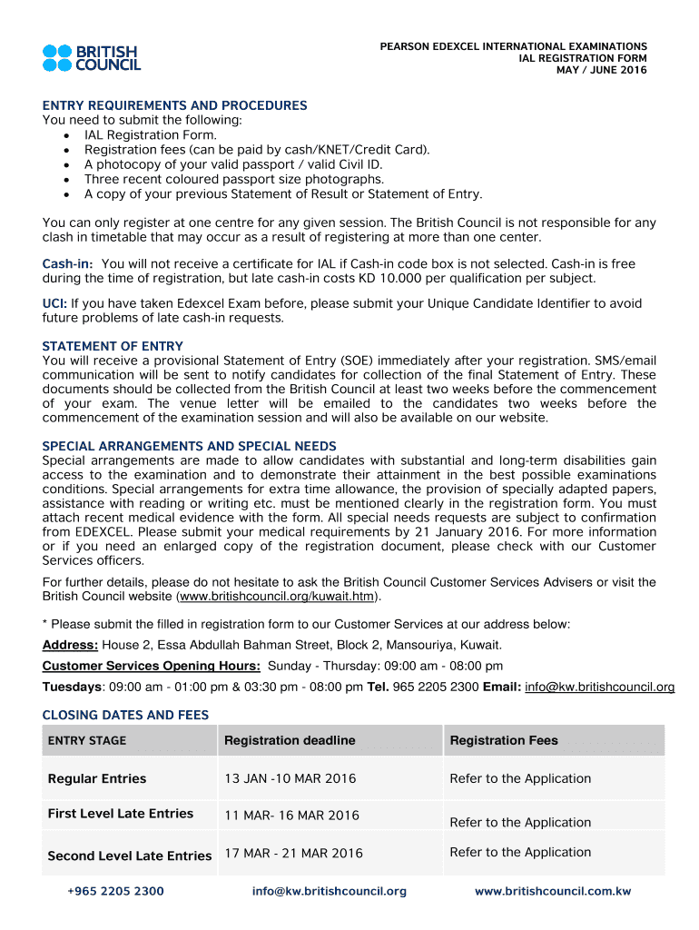 PEARSON EXCEL INTERNATIONAL EXAMINATIONS ILL REGISTRATION FORM MAY / JUNE 2016ENTRY REQUIREMENTS AND PROCEDURES You need to submit the following: ILL Registration Form. Registration fees (can be paid