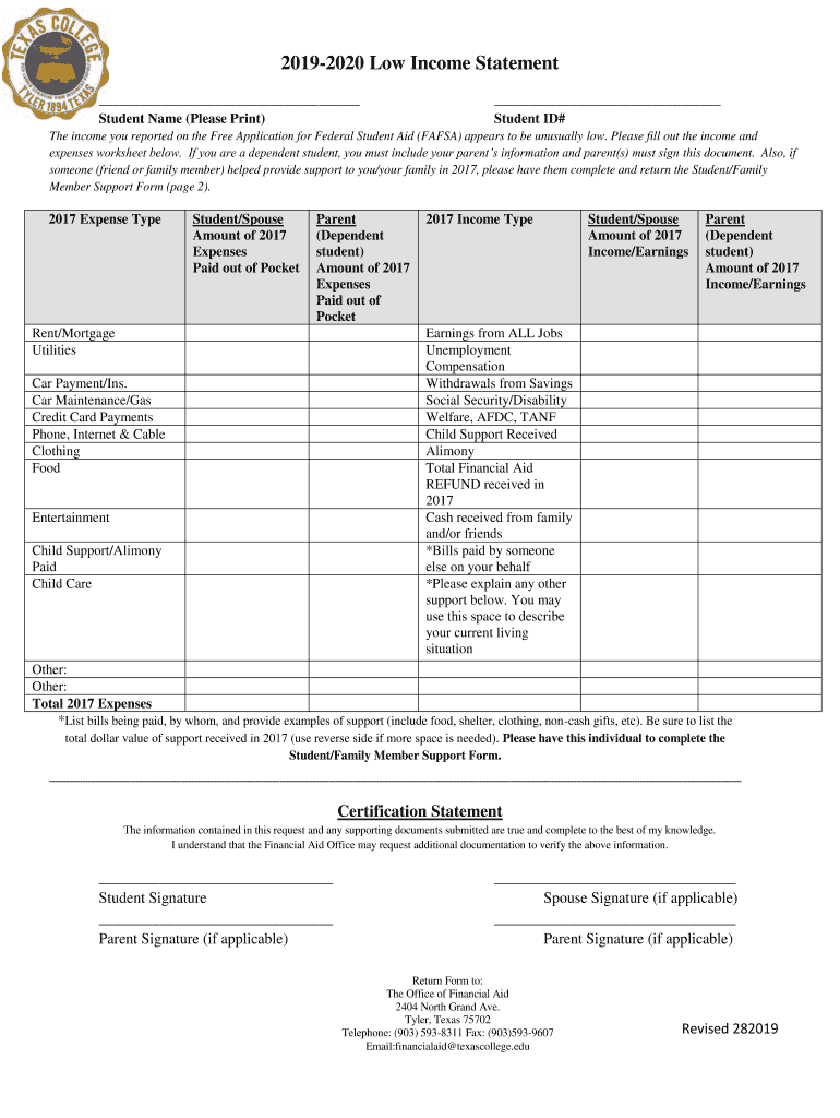 Get the free 2019-2020 Low Income Statement - Texas College