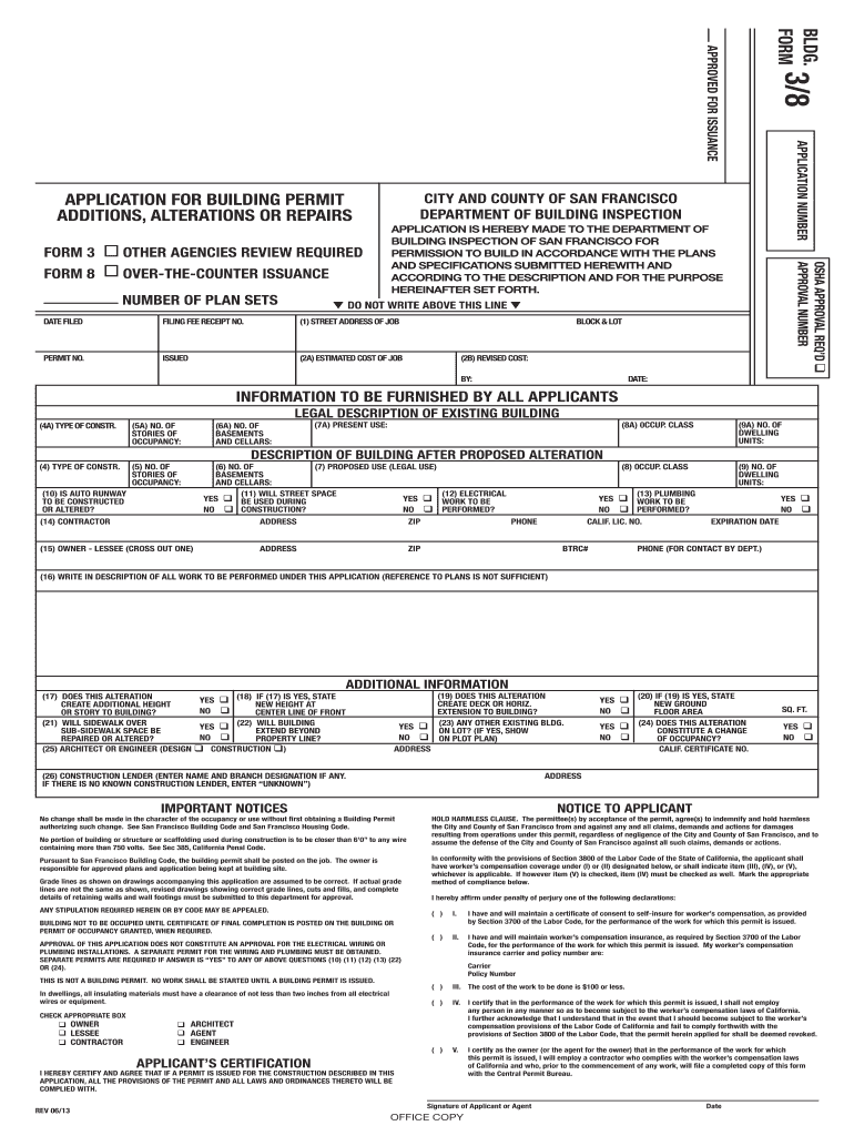 BLDG. FORM3/8APPROVED FOR ISSUANCEAPPLICATION NUMBERLESS FORMALIZATION FOR BUILDING PERMIT ADDITIONS, ALTERATIONS OR REPAIRSNUMBER OF PLAN MISAPPLICATION IS HEREBY MADE TO THE DEPARTMENT OF BUILDING
