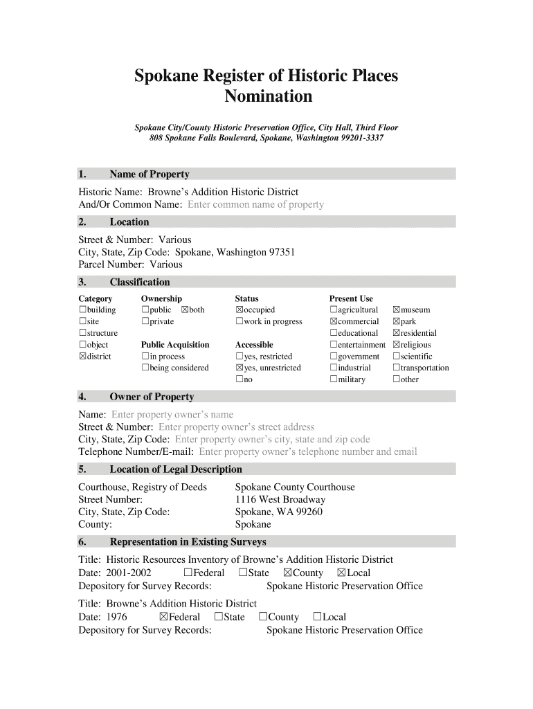 Spokane Register of Historic Places Nomination Spokane City/County Historic Preservation Office, City Hall, Third Floor 808 Spokane Falls Boulevard, Spokane, Washington 9920133371. Name of PropertyHistoric