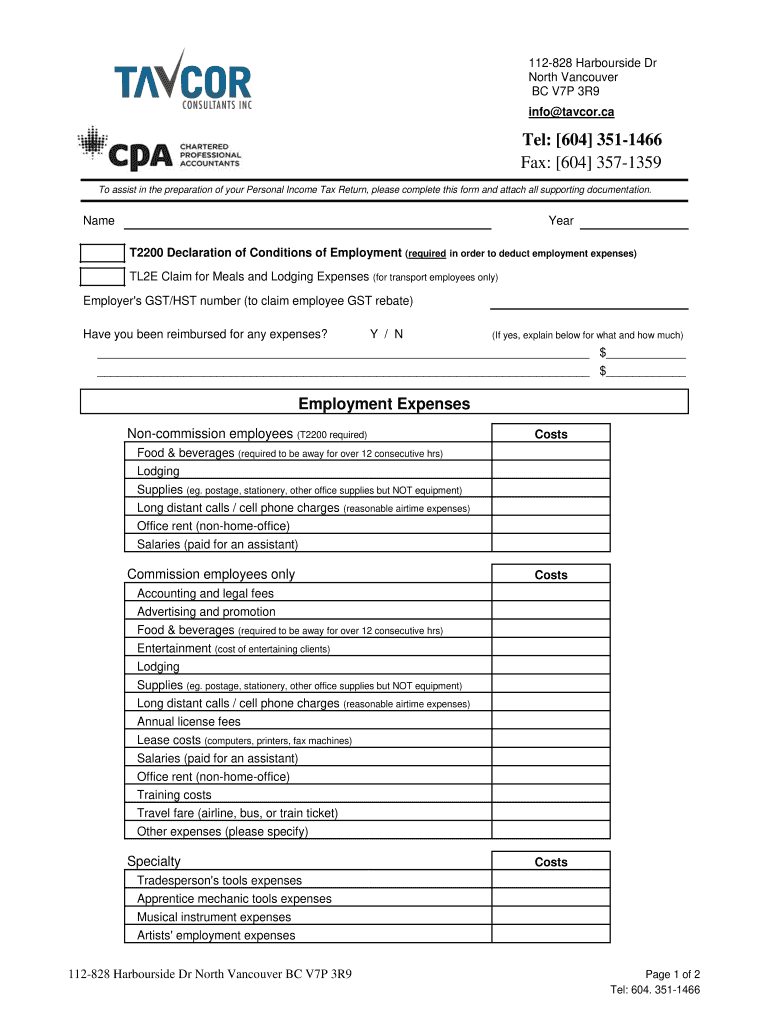 112828 Harbourside Dr North Vancouver BC V7P 3R9 info favor.cater: 604 3511466 Fax: 604 3571359 To assist in the preparation of your Personal Income Tax Return, please complete this form and attach