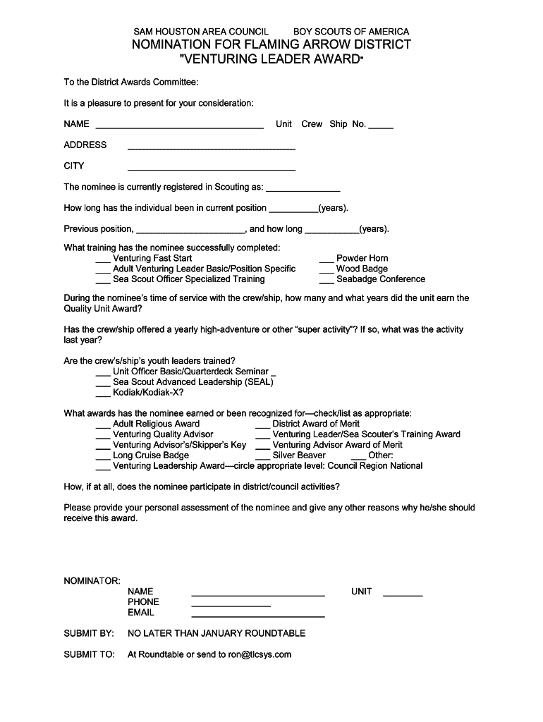 Get the free nomination for flaming arrow district "venturing leader award"