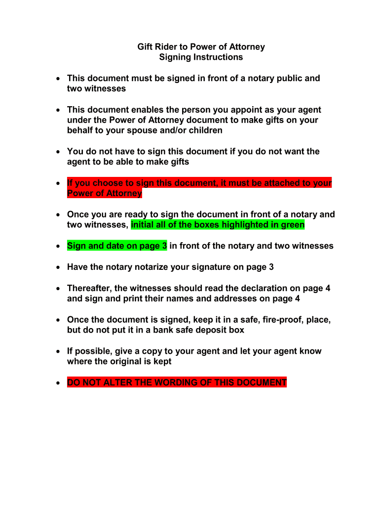 Gift Rider to Power of Attorney Signing Instructions This document must be signed in front of a notary public and two witnesses This document enables the person you appoint as your agent under the