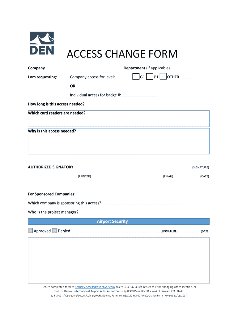 ACCESS CHANGE FORM Company I am requesting:Department (if applicable) Company access for level:G1P1OTHER OR Individual access for badge #: How long is this access needed? Which card readers are needed?