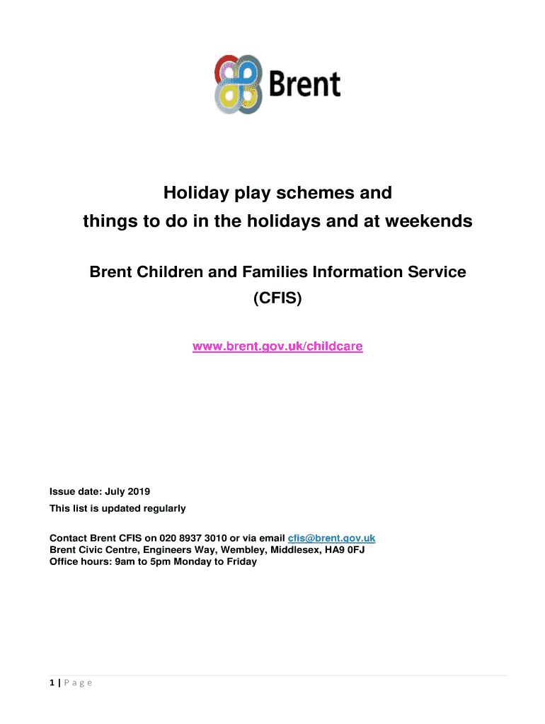 Holiday play schemes and things to do in the holidays and at weekends Brent Children and Families Information Service (CFS) www.brent.gov.uk/childcareIssue date: July 2019 This list is updated regularly