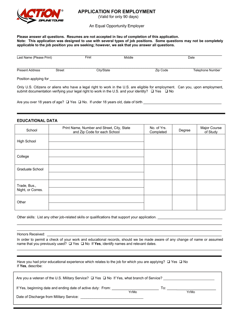 APPLICATION FOR EMPLOYMENT (Valid for only 90 days) An Equal Opportunity Employer Please answer all questions. Resumes are not accepted in lieu of completion of this application. Note: This application