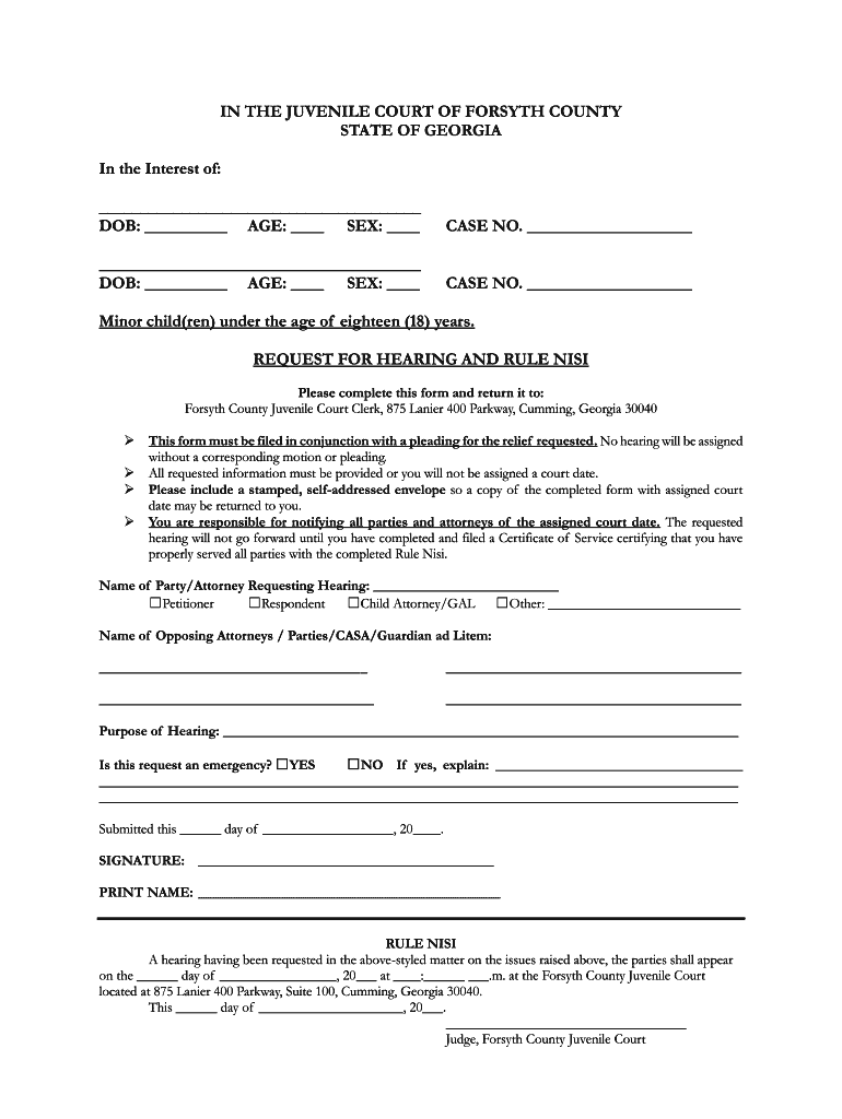 IN THE JUVENILE COURT OF FORSYTH COUNTY STATE OF GEORGIA In the Interest of: DOB: AGE: SEX: CASE NO. DOB: AGE: SEX: CASE NO. Minor child(men) under the age of eighteen (18) years. REQUEST FOR HEARING