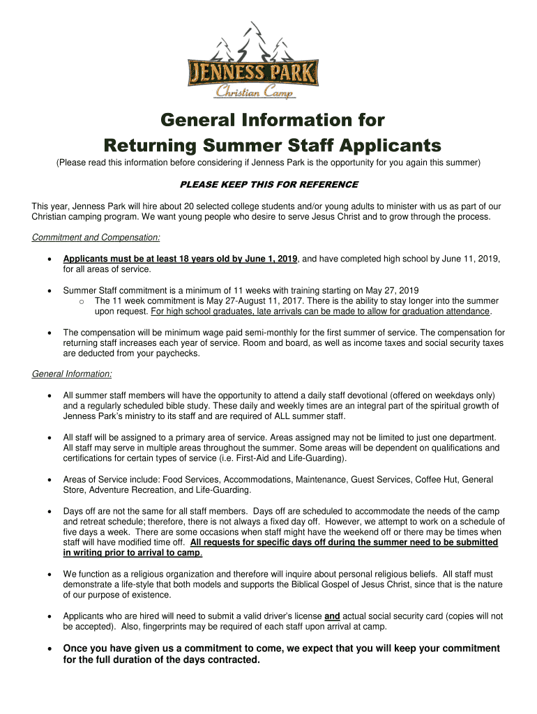 (Please read this information before considering if Jennets Park is the opportunity for you again this summer)PLEASE KEEP THIS FOR REFERENCE