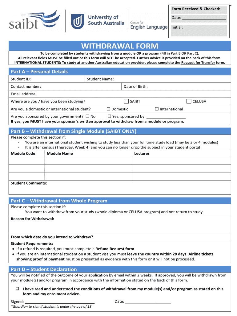 Form Received & Checked:Date: Initial: WITHDRAWAL FORM To be completed by students withdrawing from a module OR a program (Fill in Part B OR Part C). All relevant fields MUST be filled out or this