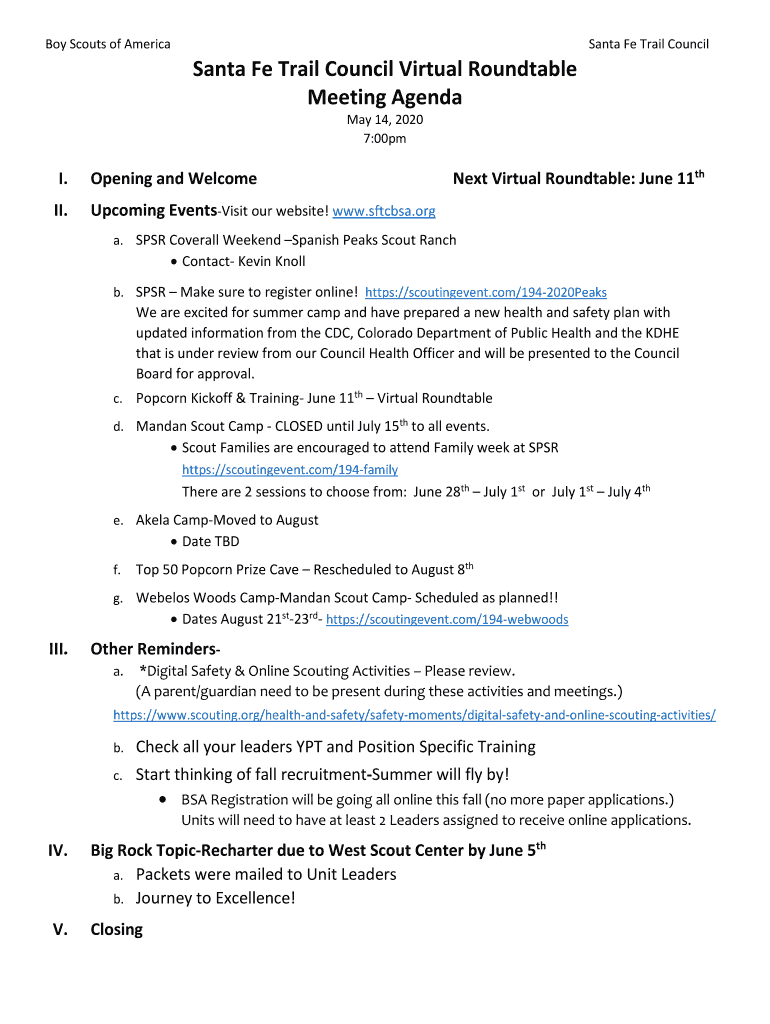 Boy Scouts of America Santa Fe Trail Council Virtual Roundtable Meeting Agenda Santa Fe Trail Councilman 14, 2020 7:00pmI. Opening and Welcome. Upcoming EventsVisit our website! www.sftcbsa.orgNext