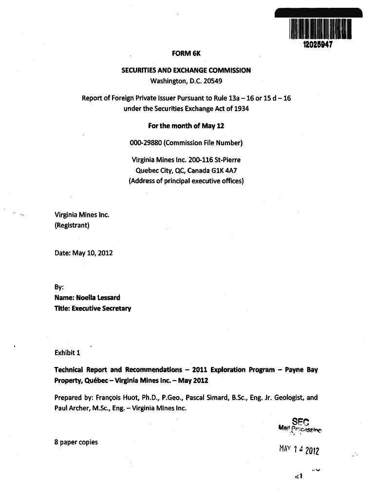 IIHIl01011111I0I12025941FORM6KAND EXCHANGE COMMISSIONSECURITIESWashington D. C 20549Report of Foreign Private Issuer Pursuant to Rule under the Securities Exchanger the00029880VirginiaofMines Inc