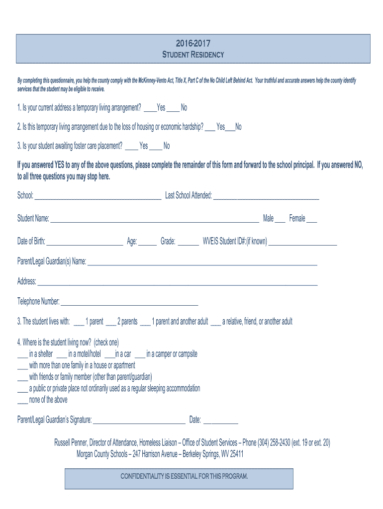 20162017 Student Residencies By completing this questionnaire, you help the county comply with the McKinneyVento Act, Title X, Part C of the No Child Left Behind Act. Your truthful and accurate answers