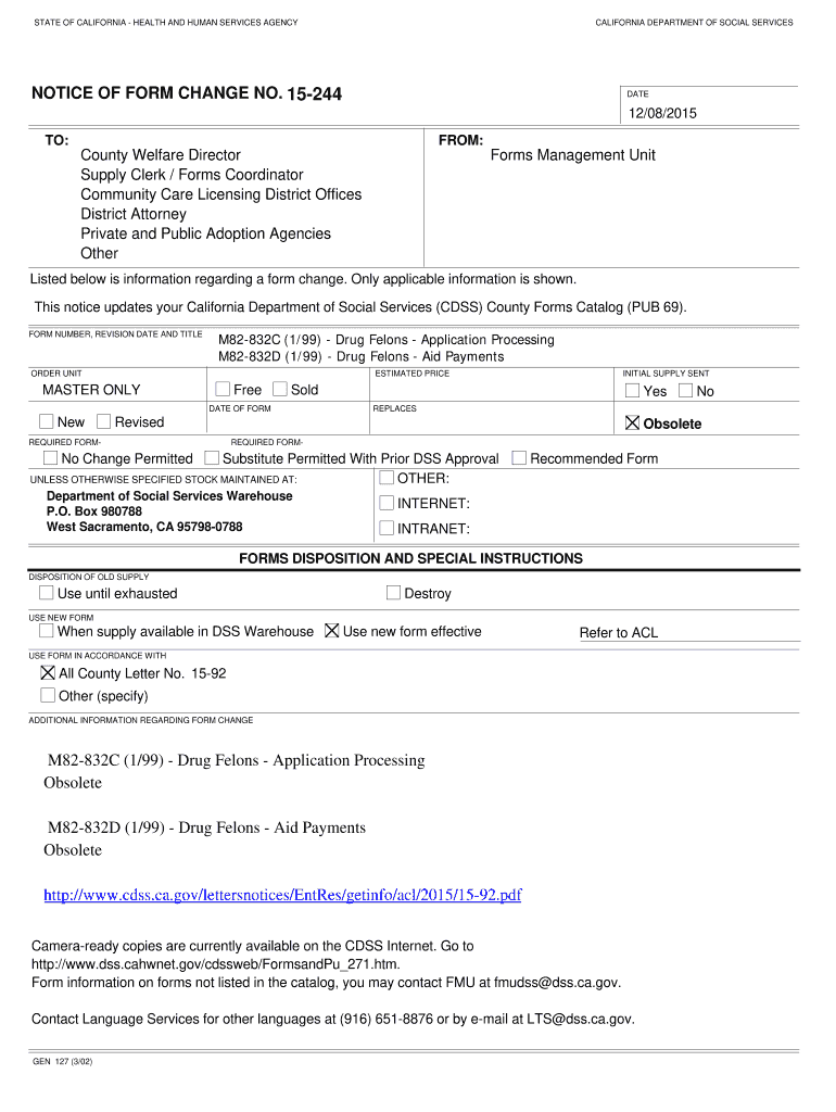 STATE OF CALIFORNIA HEALTH AND HUMAN SERVICES AGENCYCALIFORNIA DEPARTMENT OF SOCIAL SERVICESNOTICE OF FORM CHANGE NO. 15244DATE12/08/2015 TO:FROM:County Welfare Director Supply Clerk / Forms Coordinator