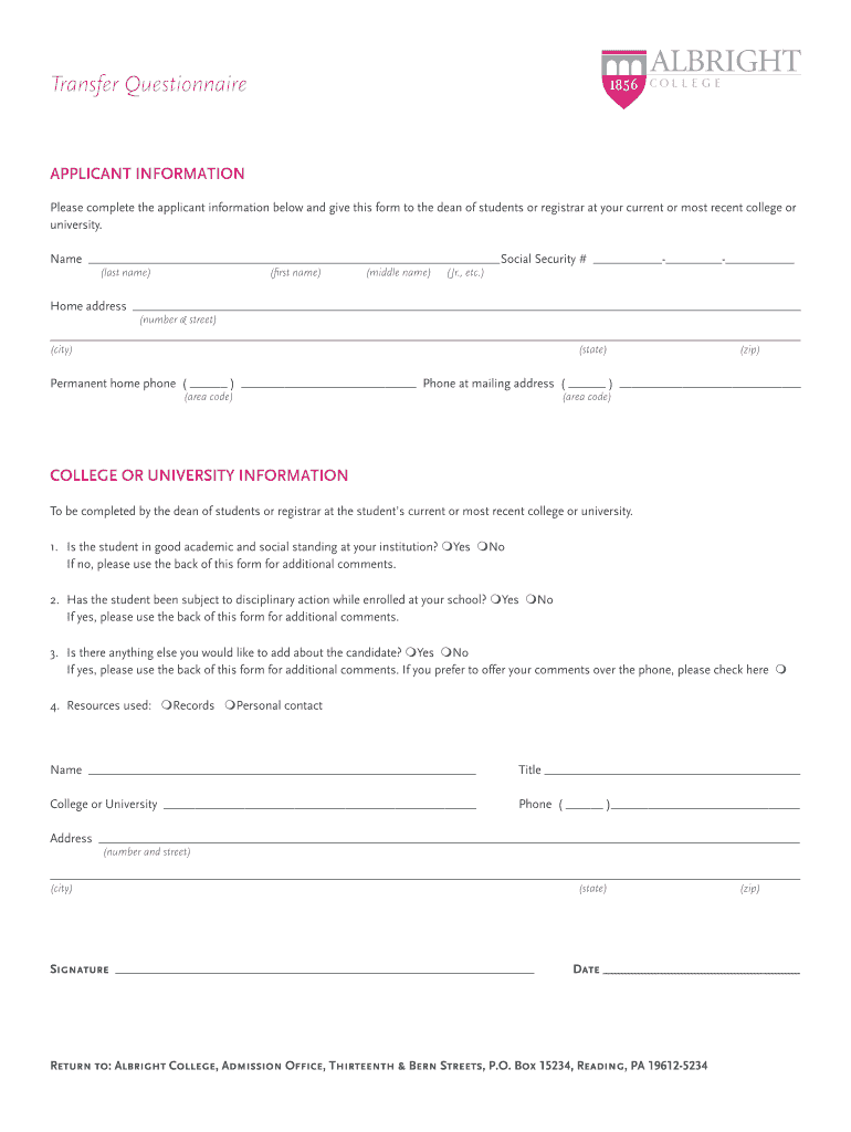 Transfer QuestionnaireAPPLICANT INFORMATION Please complete the applicant information below and give this form to the dean of students or registrar at your current or most recent college or university.