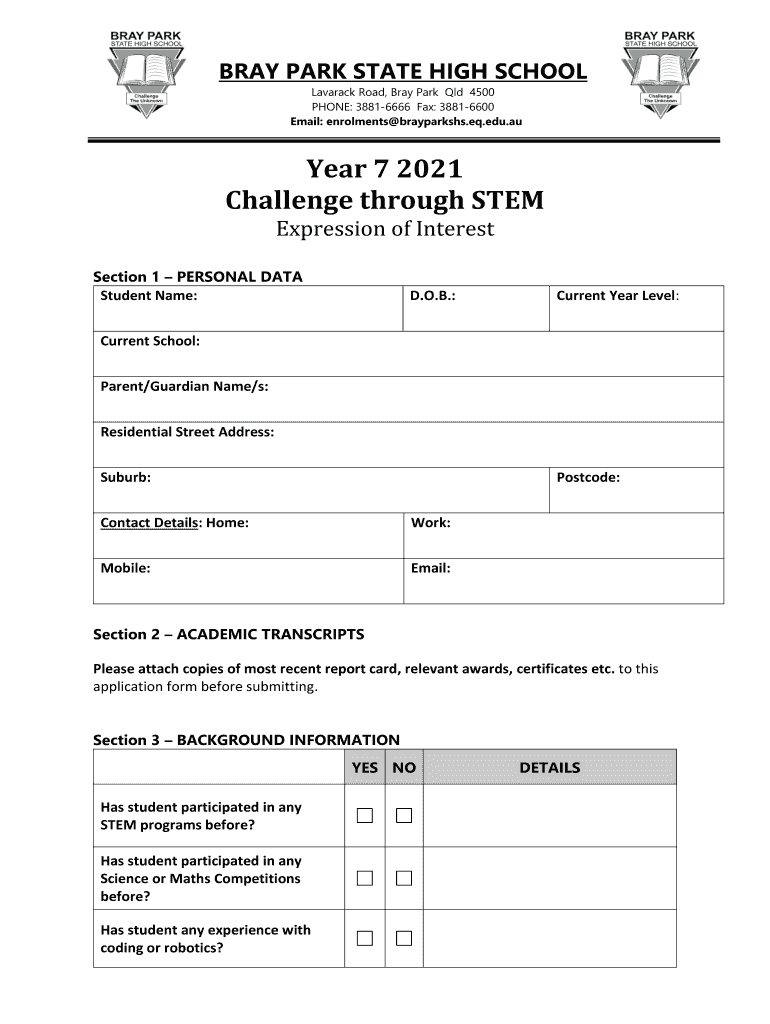 BRAY PARK STATE HIGH SCHOOL Lava rack Road, Bray Park QLD 4500 PHONE: 38816666 Fax: 38816600 Email: enrollments brayparkshs.EQ.edu.year 7 2021 Challenge through STEM Expression of Interest Section