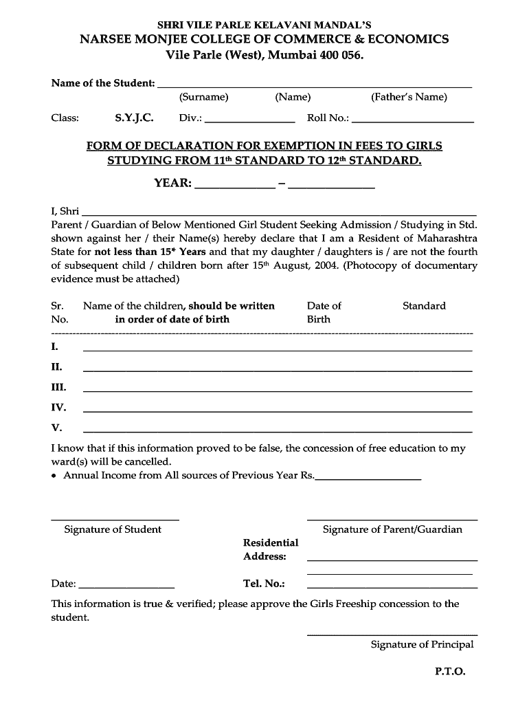 SARI VILE PALE RELEVANT MANDALSNARSEE MONEY COLLEGE OF COMMERCE & ECONOMICS Vile Pale (West), Mumbai 400 056. Name of the Student: (Surname) (Name) (Fathers Name) Class:S.Y.J.C. Div.: Roll No.: FORM