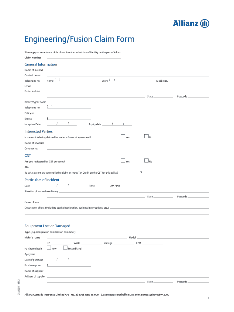 The supply or acceptance of this form is not an admission of liability on the part of Allianz.