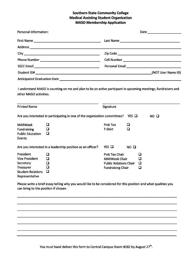 Southern State Community College Medical Assisting Student Organization MASS Membership Application Date Personal Information:First Name Last Name Address City Zip Code Phone Number Cell Number SCC