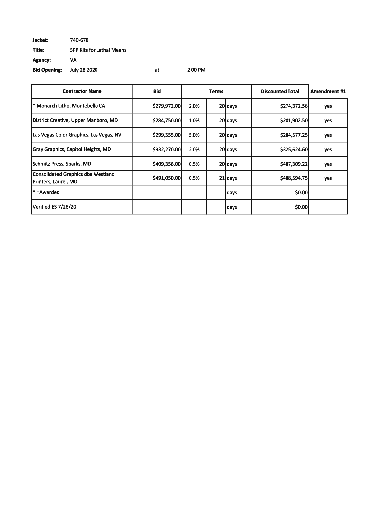 Jacket:740678Title:SPPKitsforLethalMeansAgency:VABidOpening:July282020ContractorNameat2:00PMBidTermsDiscountedTotalAmendment#1×MonarchLitho,MontebelloCA$279,972.002.0%20 days$274,372.56yesDistrictCreative,Upper
