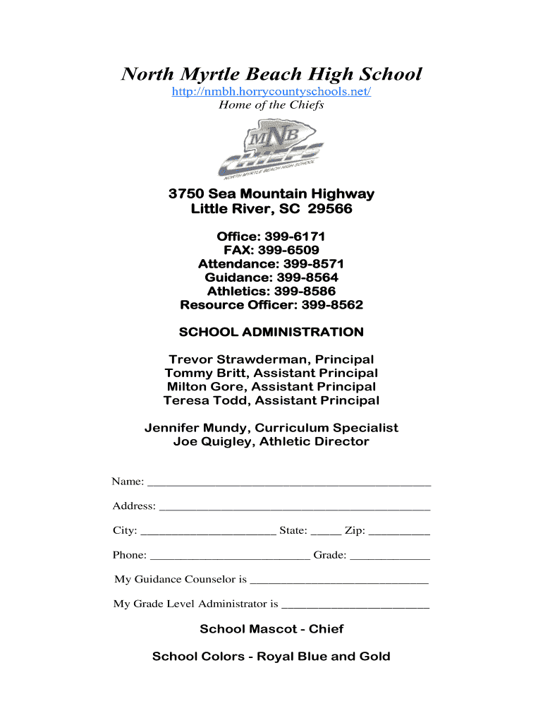 North Myrtle Beach High School http://nmbh.horrycountyschools.net/ Home of the Chiefs3750 Sea Mountain Highway Little River, SC 29566 Office: 3996171 FAX: 3996509 Attendance: 3998571 Guidance: 3998564