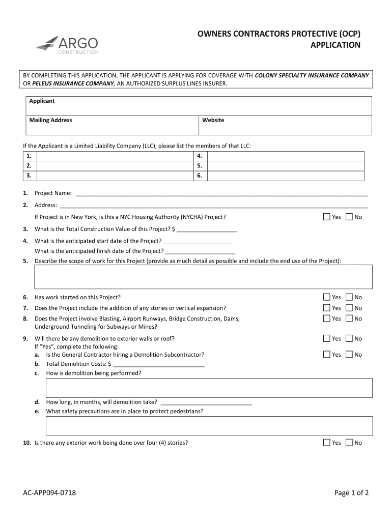 OWNERS CONTRACTORS PROTECTIVE (OCP) APPLICATION BY COMPLETING THIS APPLICATION, THE APPLICANT IS APPLYING FOR COVERAGE WITH COLONY SPECIALTY INSURANCE COMPANY OR PEL EUS INSURANCE COMPANY, AN AUTHORIZED
