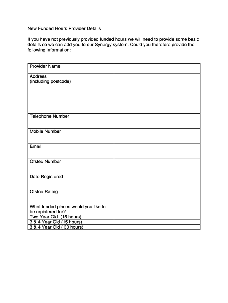 New Funded Hours Provider Details If you have not previously provided funded hours we will need to provide some basic details, so we can add you to our Synergy system. Could you therefore provide